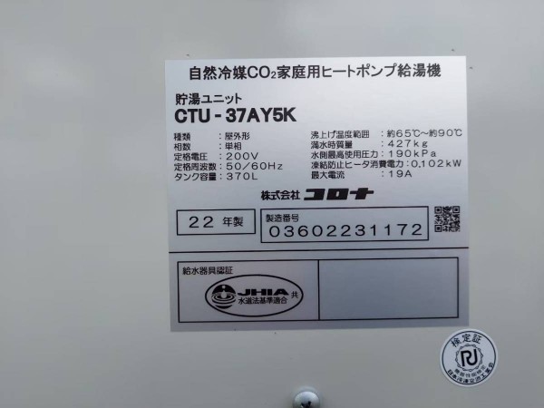 菊鹿町 コロナ自然冷媒CO2家庭用ヒートポンプ給湯機 貯湯ユニットCTU-37AY5K 給湯器交換工事