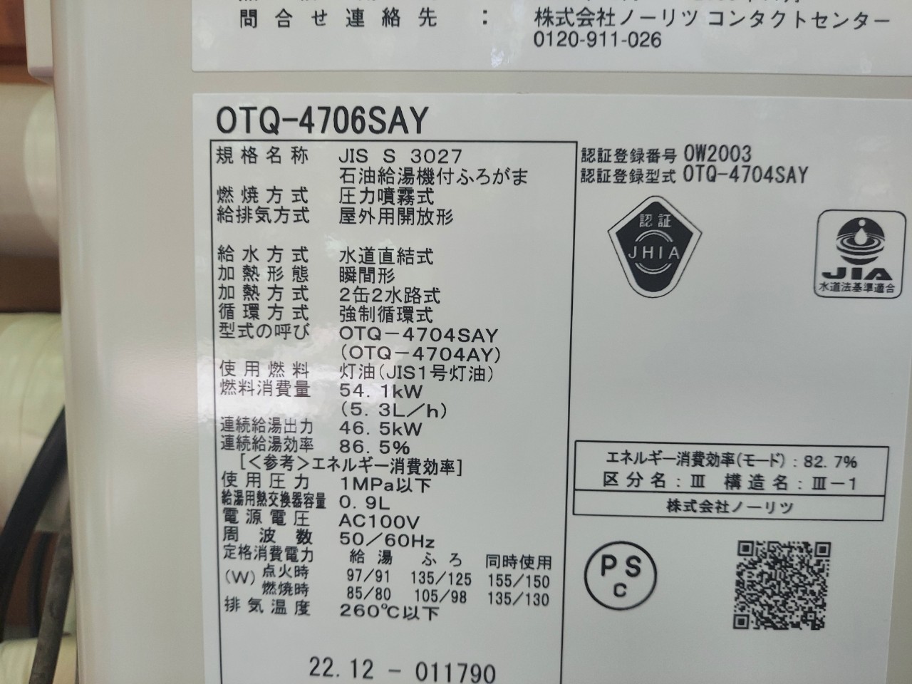 菊鹿町 ノーリツ石油給湯機付ふろがまOTQ-4706SAY 給湯器交換工事|山鹿 給湯器・ボイラー 激安価格 交換工事|山鹿給湯.com